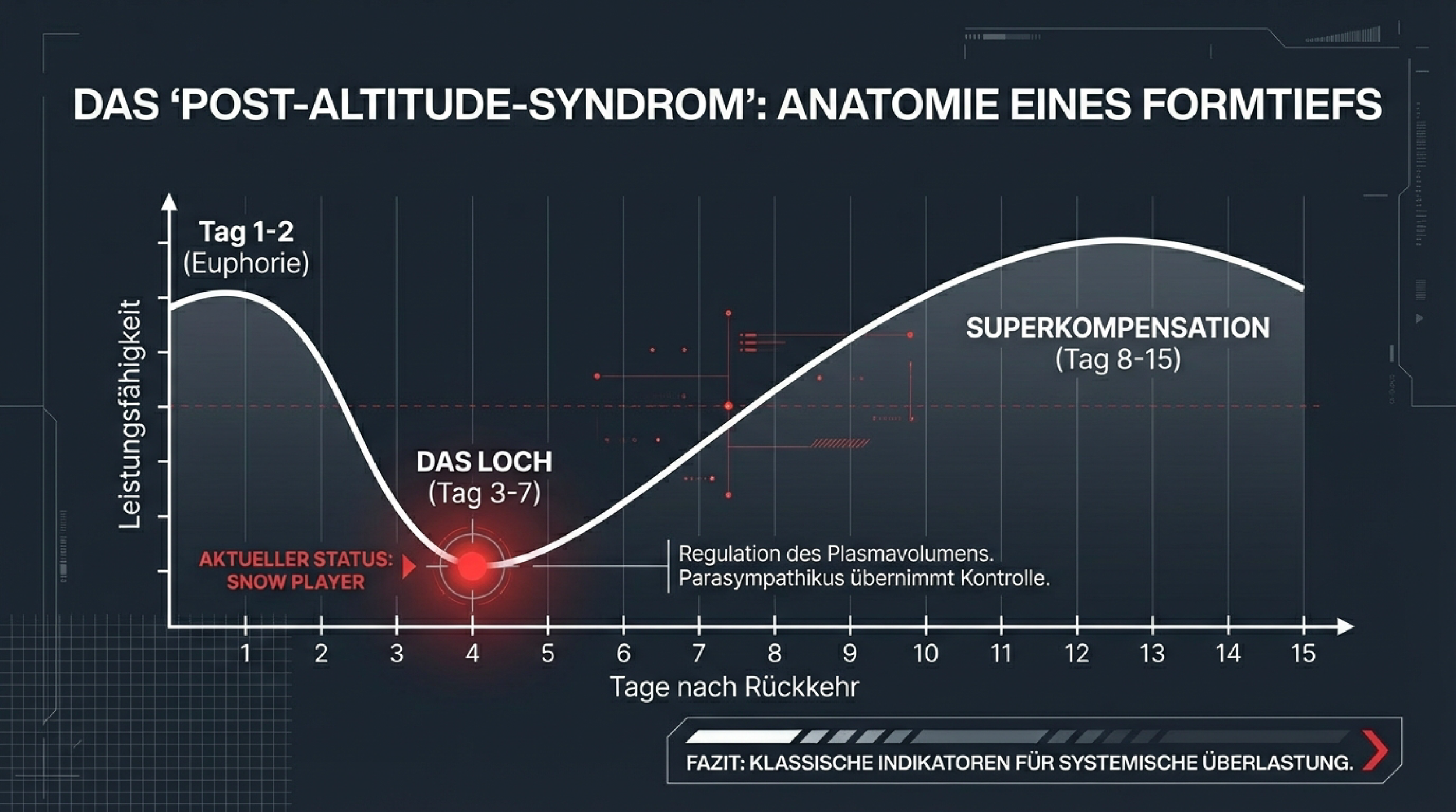 Das „Post-Altitude-Syndrom“ im Zeitverlauf: Nach einem Höheneinsatz folgt häufig zwischen Tag 3 und 7 das typische Leistungsloch – bedingt durch hormonelle Umstellung, Regulierung des Plasmavolumens und zentrale Ermüdung. Erst in der anschließenden Phase der Superkompensation (Tag 8–15) entsteht das eigentliche Leistungsplus. Snow Player befindet sich aktuell in dieser sensiblen Anpassungsphase.